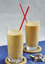 Combine milk, tofu, banana, 1 tablespoon sugar, coffee powder and ice cubes in a blender. Blend until very frothy. Taste and add more sugar, if needed. Pour into glasses and sprinkle with cinnamon, if desired. Serve immediately.